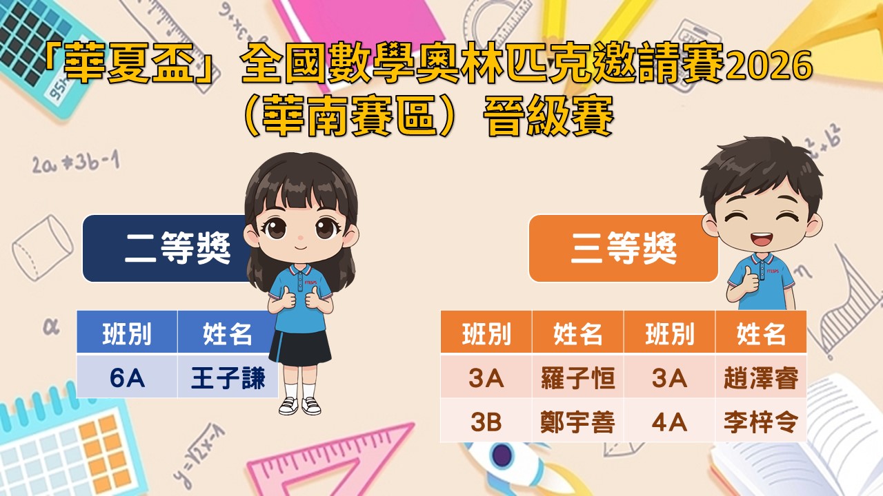 恭喜本校同學於「華夏盃」全國數學奧林匹克邀請賽2026(華南賽區)晉級賽中獲得以下佳績: