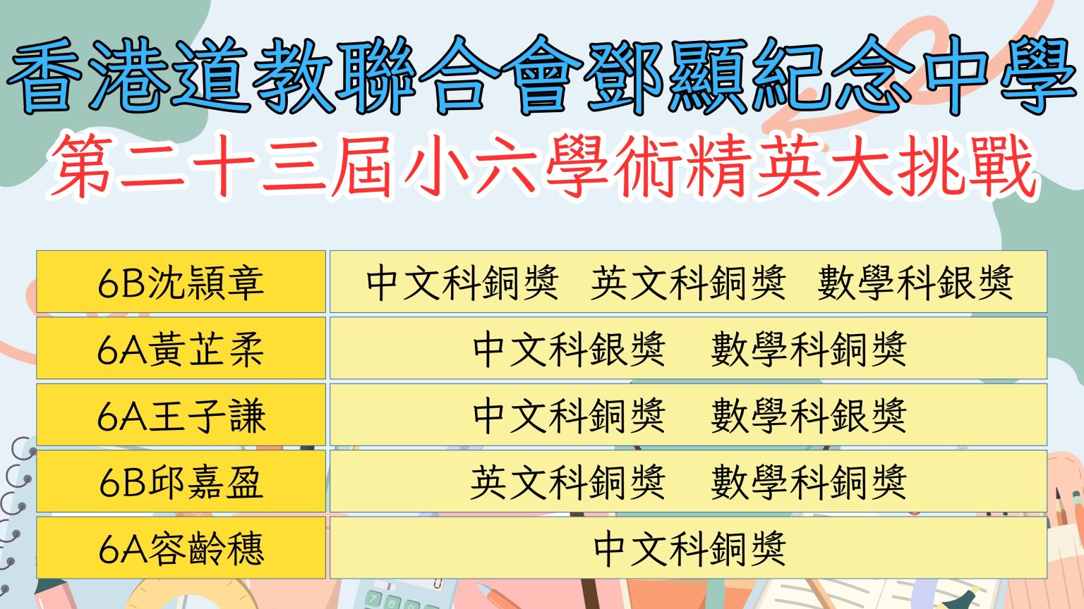 熱烈恭賀本校六年級同學於香港道教聯合會鄧顯紀念中學所舉辦的二十三屆小六學術精英大挑戰中獲得以下佳績: